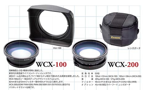 WCX-100はレンズのフィルターネジで装着するタイプでステップダウンリングで82mmまたは72mm径のレンズに装着することが可能です。WCX-200はバヨネットに装着になっていて、ソニーのEX1系カメラに対応します。