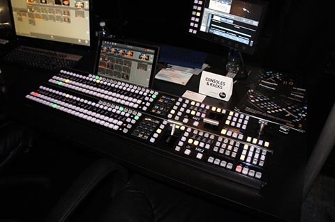 ライブプロダクションセンターAV-HLC100。1M/E8入力のスイッチャーにカメラコントロール機能が搭載されていて、カメラのパン、ティルトやズームも操作できるようになっています。