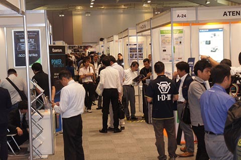 2階の受付を済ませ1階へ降りてセミナー会場の前を通って会場に入ります。会場は明るくて各ブースも見やすい印象です。モニターがある展示会は会場の照明を落としているところが多くって、そうした中に明るく照明したスタジオが設えていたりするので、結構目が疲れます。まずは、会場を一周してみましょう。