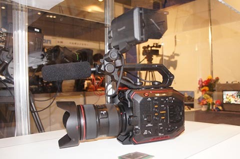 発表されている内容は、「新開発の5.7Kスーパー35mm MOSセンサーを搭載し、4K/2K 10ビット4:2:2映像を実現します。SDXCメモリーカード(ダブルSDカードスロット)に収録ができ、広いダイナミックレンジをもたらすV-Logガンマ、広色域V-Gamut、デュアルネイティブISO、4K60Pの高画質ハイフレームレートなど当社VARICAMを継承するテクノロジーを搭載しています。また、IRカットフィルターON/OFF機構を搭載することで、幻想的なIR(赤外線)シネマトグラフィ撮影を実現します。さらに、1.2kgの軽量でコンパクトな本体と、取り外し可能なデタッチャブルハンドルとグリップ、フレキシブルなLCDモニターなど新しいデザインは、ドローンへの搭載など最新の撮影スタイルに対応しています。」なんですが、今回ブースにあったのはモックアップだそうで、アクリルケースに入った状態でした。 幻想的なIR撮影ってどんなんか見てみたかったんですけどね。残念です。