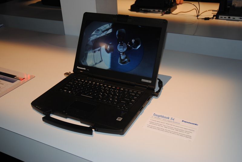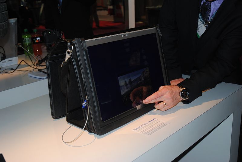その横にはTOUGHPADやTOUGHBOOKが並んだ陳列台がありました。これで編集?って思いましたが、そういうことではなさそうです、プレゼンに使ったりお店とかに置いて商品やサービスの説明に使うということのようです。でも、20インチはデカすぎです。なんか小学校の時の写生に使った画板を思い出してしまいました。