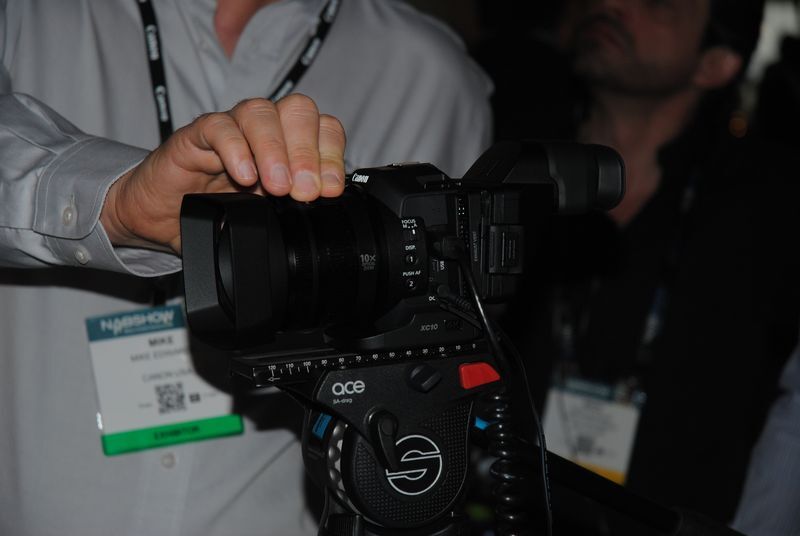 あそうそう、こうした4K対応の新製品が目立ってますが、HDの小型ビデオカメラXF205も新製品です。XF205は後発ということもありますがなかなかいいカメラだと思います。広角28.8mmからの20倍ズームレンズで、CFとSDメモリーカードスロットがあってCFにはMXFで50Mbps、SDにはMP4で35Mbpsとなっており、同時記録も可能です。ソニーのPXW-X180と違って4chオーディオ対応です。4K ビデオカメラXC10とEOS C300 Mark IIにはキヤノン独自のビデオフォーマットXF-AVCフォーマットが採用されています。XF-AVC 記録は305Mbpsと205Mbpsでの記録になっていてCFastメモリーへの記録になります。HD記録は50Mbpsまたは35Mbpsで、SDカード記録です。実際このカメラを現場で見た第一印象はちっちゃい!。業務用のカメラを見慣れているせいもあるかもしれませんが、民生機のカメラと見間違えるほどです。でも、1型のセンサーで、レンズも27mmからの10倍ズーム搭載、8bit Canon LogとワイドDRガンマも選択可能となってます。あと感度もISO20000で、最大1/4倍のスローモーションや最大1200倍のファーストモーション記録にも対応しています。ちっちゃいからってナメてはいけませんね。この大きさなんで色々操作ボタンとかボディに付けられないんで、設定とかはLCDモニターで行います。3型のモニターなんで、指の太い人には操作しづらいかも。