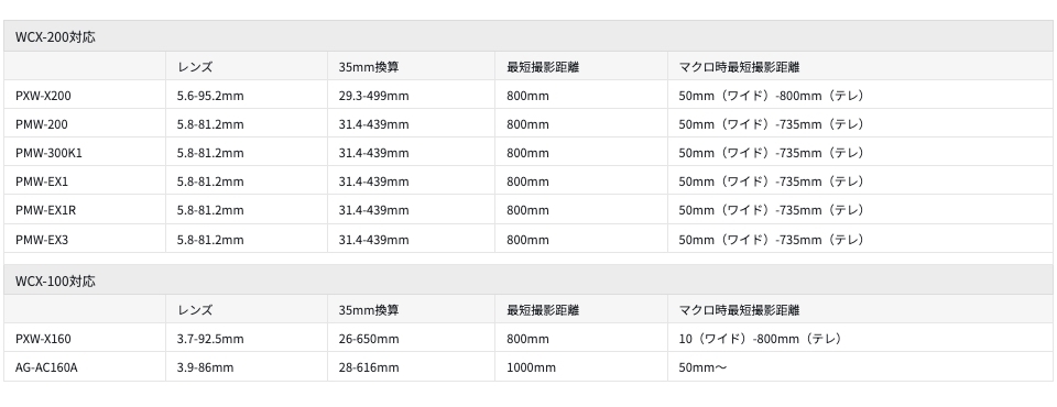 WCX-100はレンズのフィルターネジで装着するタイプでステップダウンリングで82mmまたは72mm径のレンズに装着することが可能です。WCX-200はバヨネットに装着になっていて、ソニーのEX1系カメラに対応します。
