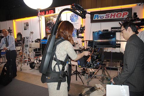 三和映材さんはレンタル中心の会社なんですが販売もやっていてイージーリグ Vario5というユニークなカメラスタビライザーを出展していました。実際に体験できるということで、人気がありました。