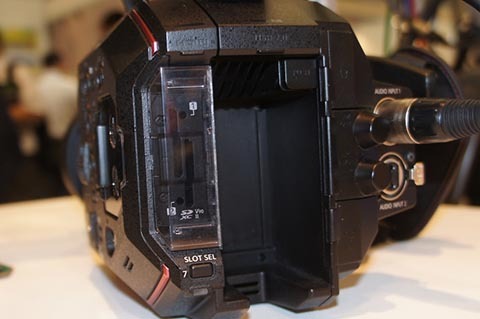 SDメモリースロットを2基備えているAU-EVA1はリレー記録のほか、異なるコーデックでの記録も対応する予定。バッテリーはAG-DVX200と同じ7.2V系のもの。
