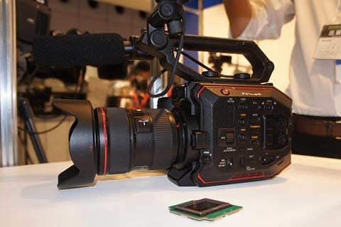 パナソニックさんは地元の大阪ということもあり、新製品を中心としてカメラやスイッチャー、アーカイブシステムなどを出展していました。今回の注目の製品はなんといってもNABでベールがかぶっていたカメラでしょう。6月5日にAU-EVA1という型番で新製品として発表しているのですが、あまり詳しいスペックは公表されていません。