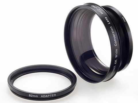 77mm径や82mm径の大口径レンズに装着できる4K対応ワイドコンバージョンレンズになります。 倍率はx0.83倍で重さはおよそ450gとWCX-85よりも軽量になっています。標準付属品として77mm(ワイコン本体に取付けてあります。)と82mmの2個のアダプターリング(ご使用の際は必ずどちらかをつける必要があります。)とセットスクリュー用のドライバーと前後のキャップが付属しています。