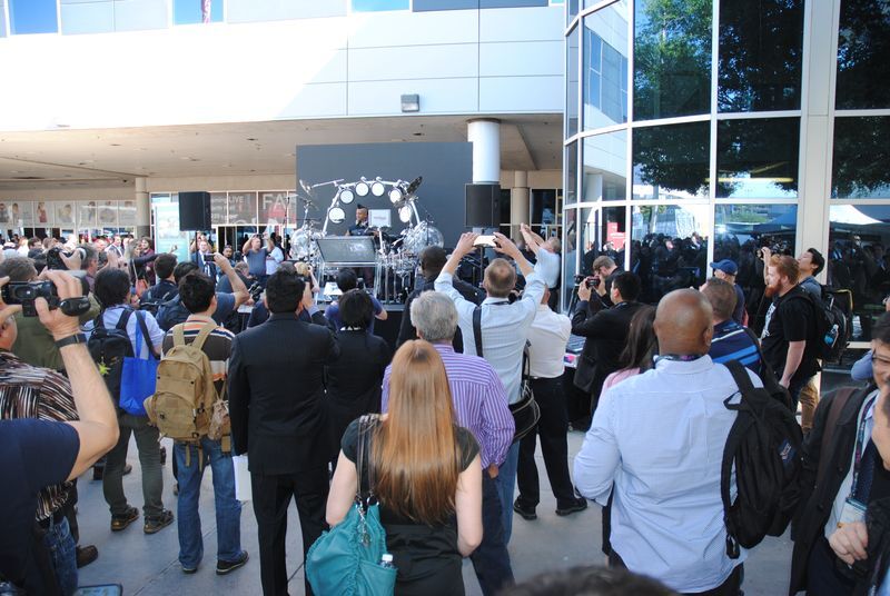 音楽に合わせて電子ドラムを叩いていました。人垣ができるほどなので、有名人なのかも。