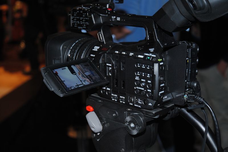 HD小型ビデオカメラXF205。回転グリップやフォーカスとズーム、アイリスを独立して操作できます。有機ELのモニターも搭載していて使い易そうな感じです。