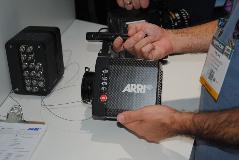 ALEXA Miniは最近はやりのドローンによる撮影やジンバルに搭載しての撮影に対応したカメラだそうです。電動NDフィルターやレンズモーター制御機能が搭載されていてこうした撮影に向いた仕様になっています。15cm角ほどの大きさで操作部分もほとんどありません。なんかARRIらしくないデザインですね。ARRIでは他にもニューモデルになったALEXA SXTやProRes UHDに対応したAMIRAなどがブースに並んでいました。