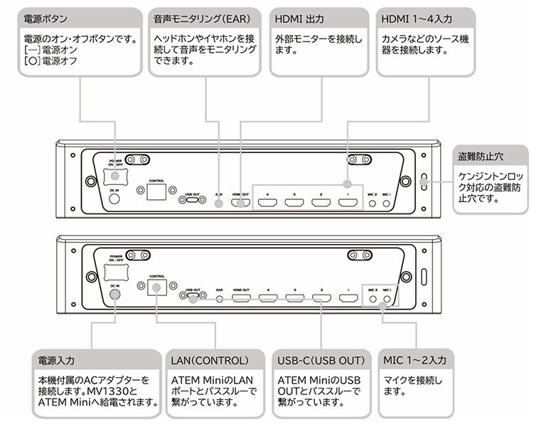 「MV1330」のモニターに表示される映像は背面HDMI入力より分配された信号が入力されますので、スイッチャーを通した信号ではございません。スイッチャーへの入力信号確認は必ず、HDMI OUTの信号各チャンネルをご確認願います。